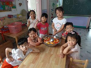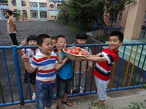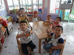 种植园的西红柿成熟了,中一班的宝贝们采摘了西红柿,在老师的帮助下,一起动手将西红柿切块,加入好吃的梨块、桃块,加入酸奶、砂糖,最后搅拌均匀,好吃的蔬果沙拉做成了。宝贝们品尝着自己的劳动成果,心里美美的。大家快来品尝哦!
