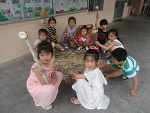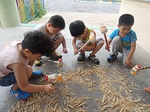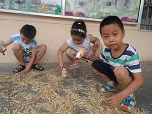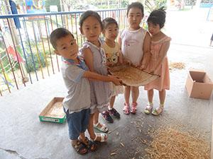 我们大一班的麦子丰收啦,在老师的带领下,我们把麦穗放在了地下,用小垂头打出麦粒,最后用簸簯把麦壳簸出去,啊!麦粒出来了,小朋友们太开心啦!