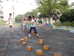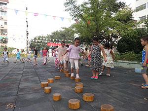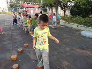 小马队伍来到了小河边,望着深深的小河发愁,但聪明的小马们想到了一个好办法,垫着石头过河!今天,我们大三班的小朋友们扮演小马,互帮互助,踩着石头一起过河,此次活动锻炼了孩子的平衡能力。