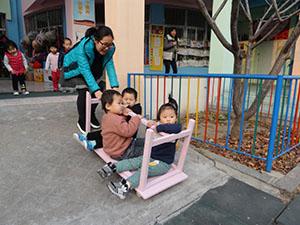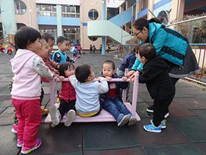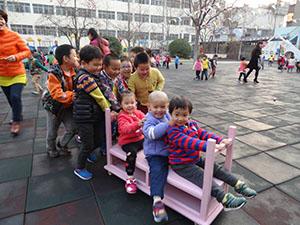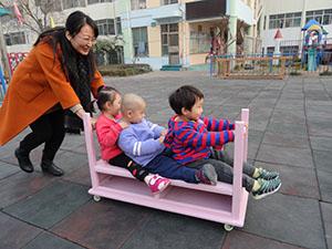 照片上的孩子们玩的非常嗨,因为小六班的孩子们坐上了“创意小车”,小车是经过废旧桌子改装而成的,部分孩子坐上去,部分孩子进行推车,在此活动中孩子们提高了躲避危险、及时刹车、准确拐弯的能力,准备好,小车就要启动了!