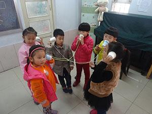 今天大一班的我们用纸杯制作出好玩的传声筒,两个纸杯,用一根线链接起来!这样传声筒就做好了!我们伙伴之间玩起了“悄悄话”和“打电话”的游戏,我们还尝试了多人交叉的通话实验,哈哈!可以开小组会议了!我们玩得太开心了!