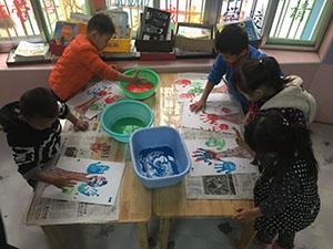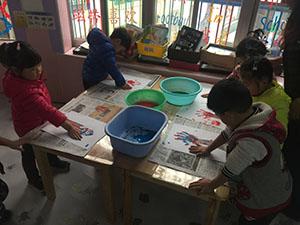 一棵粗粗的大树干,长出无数小手印,这一只,那一只,像是一个棵招手树,在召唤小朋友快快围上去,红色、绿色、还有蓝色,多彩的招手树,在向美好的未来招招手~