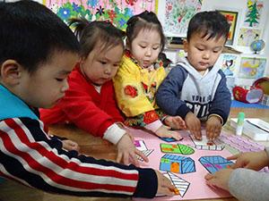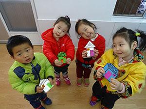 每个幼儿的心里都有属于自己的房子,孩子们在不同的房子上黏贴着美美的门窗,大家又将自己的房子黏贴在最大的房子里面,孩子们说:“瞧,我们的房子都住在一起了。”本活动锻炼幼儿动手操作能力、创新能力和对爱的初步理解的能力。