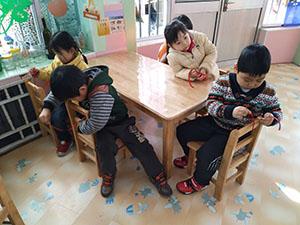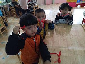 中二班的小朋友们在听过漂亮的蝴蝶结的故事后,大家都对系蝴蝶结跃跃欲试。今天小朋友们在老师一步一步的指导下开始练习系蝴蝶结了。首先在小椅子上练习绕圈系,然后大家边念儿歌边系蝴蝶结,“先绕一个圈,在然一个圈,两头交叉绕一绕,拉拉紧。”虽然有些不成功,但我们会继续加油的!