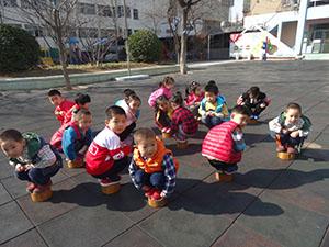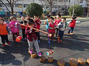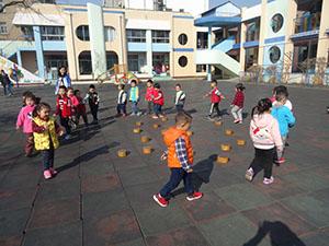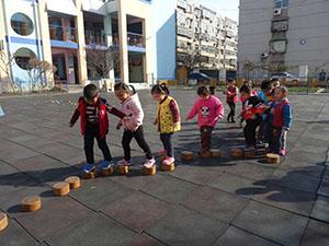 漂亮的小木桩可以一物多玩,小二班的孩子们通过走独木桥、障碍走、木桩站立等游戏锻炼平衡、协调、快速反应的能力。你们敢来挑战吗?