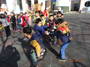 今天小四班的小朋友能随着儿歌的节奏玩捉鱼游戏,两名小朋友手拉手做“网鱼”,其他幼儿做“小鱼”,一边说儿歌一边依次穿过“鱼网”。小朋友们有序的做游戏,体验了游戏带来的快乐~