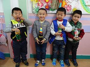 中四班的宝宝们,都从家里收集来了各种玻璃瓶,自由选择橡皮泥、纸绳、彩珠、亮片等材料,帮助废旧玻璃瓶们华丽变身,幻化成为一个个漂亮的花瓶艺术品呐。