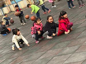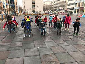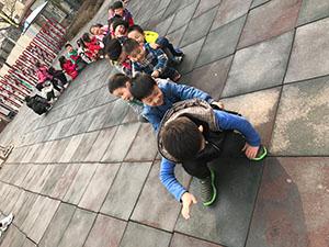 动动手来,动动脚。在我们热身活动结束之后,开始了许多腿的游戏。似乎很容易就能猜到我们游戏的名字——蜈蚣竞走。这不仅锻炼了我们身体协调能力还提升了我们游戏的耐心和耐力,因为一不留心整个蜈蚣团队都会散架。看我们玩得多开心啊!哈哈,最后都玩累了蹲着休息休息!