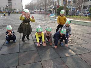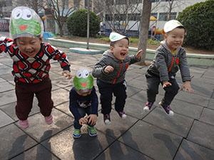 一群小五班的“小青蛙们”正开开心心的做游戏呢,围成了一个大大的圈,相互之间呱呱的打招呼问好,老师告诉孩子们游戏规则与要求, “小青蛙们”就开始了往前跳,往上跳的练习,这不仅锻炼的孩子身体协调能力,还锻炼了孩子的意志力,瞧~小朋友玩的多开心呀~~