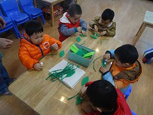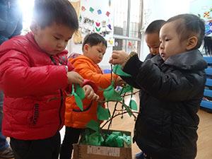 春天来了,孩子们捡来了枯木枝,希望可以长出柳枝和柳叶,于是孩子们利用绿色的皱纹纸搓成条状,又撕了一些绿色的柳叶,用胶棒将柳枝和柳叶黏贴在一起,最后“长”在枯树枝上,一颗嫩嫩的柳树就完成了。本次艺术活动练习了涂抹、黏贴的方法制作柳条;锻炼手眼协调能力。