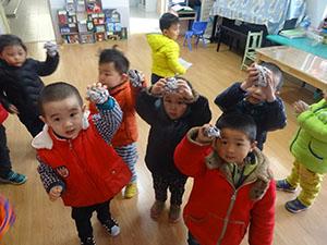 小六班的孩子们虽然年龄小,但是玩起游戏来都非常勇敢,瞧,孩子们正在用废旧报纸制作炸弹,将报纸捏(揉)成团,进行自抛自接;游戏中还练习了炸弹投掷;教师将雨伞倒过来,幼儿进行投高练习。本次健康活动锻炼了幼儿捏、揉的精细动作练习、投掷动作练习,给予了幼儿勇于挑战的机会。