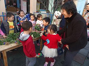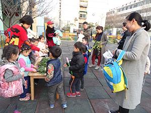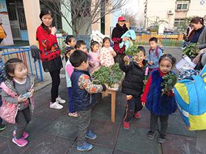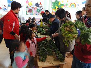 中四班宝贝们,收获了满满四筐香菜和菠菜,紧锣密鼓地忙碌了大半天,捆扎、摆放、装扮会场……傍晚时分,终于迎来了尊贵的客人们!绿色蔬菜特卖咯~无污染,真有机咯~走走看看,纯绿色蔬菜~~