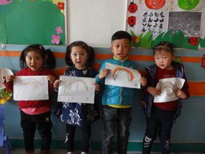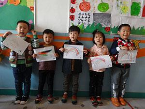 今天小四班的小朋友欣赏好听的故事《彩虹国》,初步了解“彩虹”这一自然现象,尝试运用彩虹的其中颜色进行绘画,利用红、橙、黄、绿、青、蓝、紫颜色的油画棒画出美丽的彩虹。瞧,我们绘画的好看吗?