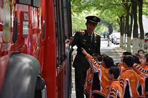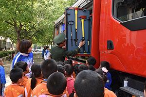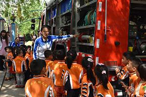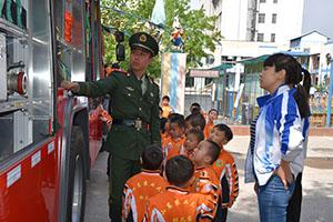 首先,迎胜中队的贾学博队长为大家讲解了防火的重要性和火灾发生后的报警求救方法,结合实物介绍了常用的几种消防器材,并现场演示了灭火器、防毒面罩等的使用方法。然后,各班小朋友和老师在消防官兵的介绍下参观了消防车, 观看了消防车水枪喷水和灭火。