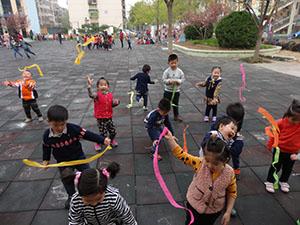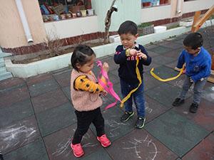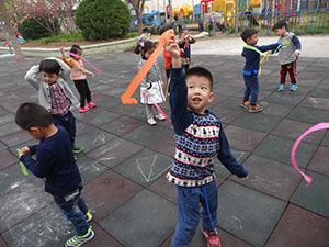 今天老师带着小朋友一起进行《彩带飞舞》活动,我们在教室里用各种颜色的皱纹纸,剪成彩带,然后去户外观察彩带飞舞,彩带飞起来特别的漂亮!通过这个活动不仅锻炼了孩子们动手能力,还拓展了孩子身体协调能力.小朋友玩的很开心!