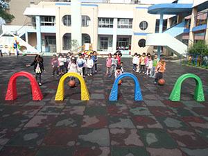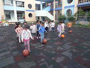 幼儿通过健康活动《小球钻山洞》,感知球的滚动,以及按照游戏的规则:用脚踢球过山洞来进行游戏。并乐意与同伴玩球,体验与同伴共同游戏的快乐。