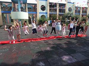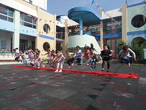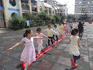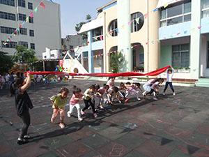 大二班小朋友都知道,长长的红绸子是跳大秧歌时用的。今天,我们用彩绸来做游戏,看!我们彩绸平铺在操场上彩绸就成了小路,轻轻走过去,锻炼了身体的平衡能力,我们把彩绸当作小河跳过去,发展了跳跃技能;我们把彩绸当作大山洞钻过去……
