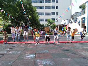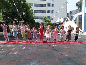 今天,大三班的小朋友运用彩绸做了有趣的游戏,我们先把彩绸变成小路,小朋友们依次走过;又把彩绸变成一条小河,请小朋友用双脚跳的方式过小河,并增加小河的宽度。小朋友们运用彩绸,发展跳跃技能和平衡能力,在游戏中锻炼了身体。