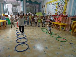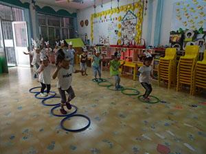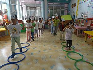 今天,小三班开展了一节好玩的健康活动。小朋友们带上小兔子的头饰一起玩“拔胡萝卜”的游戏。大家一个接着一个双脚跳过呼啦圈。小朋友们都跃跃欲试,玩的开心极了!活动中不仅锻炼了大家双脚跳跃的能力,还体验了游戏的乐趣。你也快来和我们一起玩吧!
