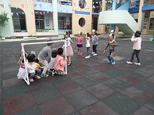 小一班幼儿通过游戏,掌握走、跑、跳等技能,提高身体的协调性和平衡性,并能运用自己身体各个部位来探索不同的动作,从中体验运动的快乐。