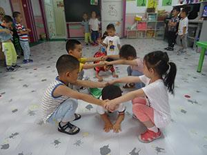 小二班的孩子们根据山洞的特点,一起讨论山洞的玩法,通过钻与爬两种方式一起越过障碍过山洞,想象并尝试两人一组搭成高矮不同的山洞钻与爬,锻炼了孩子们双手着地、曲膝钻与爬的技能。