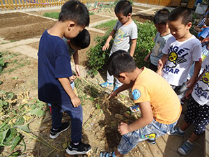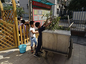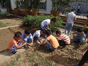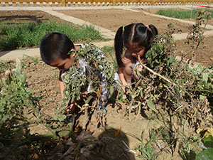 上个学期种植的黄瓜和西红柿,已经圆满地完成了自己的任务。新学期伊始,升入大三班的孩子们面对枯萎的秧叶,与它们愉快的道别。