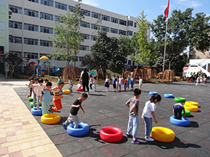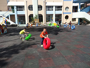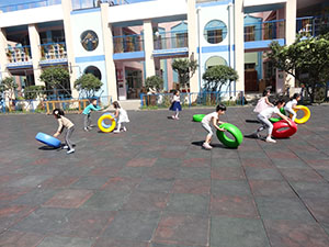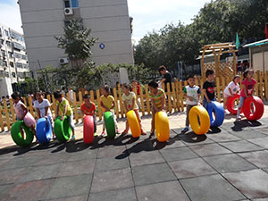 蓝蓝的天,白白的云,小朋友们一人一个彩色的轮胎,在蓝天白云的映衬下显得格外好看,拿到轮胎,讨论玩法,每个孩子的小脑袋点子层出不穷,一个小小的轮胎玩出了那么多花样,满院彩色,满院希望。
