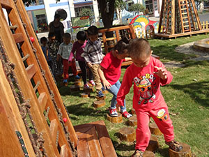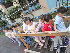 瞧!这一群小伙伴们在做什么?哈哈哈!一排一排搭积木、一个一个走吊桥、慢慢踩着小木桩、累累就在凉亭休息一下,做手指游戏。看看这儿、玩玩儿那儿, 幼儿园里真好玩儿。既锻炼了小身体还增进了小伙伴之间的友情。悄悄告诉你:我们可是农大幼儿园小三班的新朋友们哦。