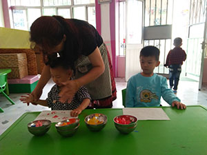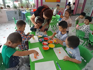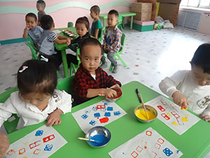 花床单,真漂亮,今天小二班的小朋友也自己制作“花床单”:拿着自己喜欢的小“印章”,在颜料盘里沾上颜色,在空白处印画。看,小朋友做得多漂亮啊,看着自己的作品,都笑的多开心啊!