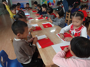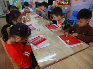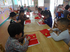 十月一日是国庆节,是祖国妈妈的生日。为了给祖国妈妈过生日,老师教我们中四班的小朋友做了国旗。我们在红色亮光纸上粘上五颗星星,还给红旗做了旗杆,是不是很漂亮!