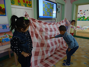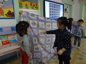 今天我收集了好多花床单给幼儿展示,孩子们纷纷举手说自己的花床单也很漂亮,我运用变魔术的方式将实物花床单变入了大屏幕中,孩子们好奇的不得了,通过观察使孩子们学会空格式的填色方法。本次艺术活动锻炼了幼儿动手操作能力以及思维能力。
