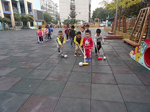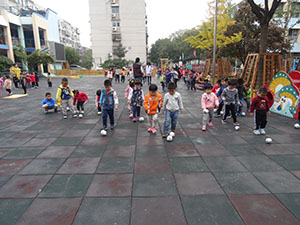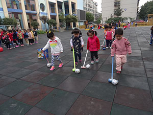 小五班的孩子利用推、赶、踢的方法保持协调、灵活地把走丢的球宝宝送回了家,孩子们体验了帮助球宝宝的快乐又增强了对体育活动的兴趣。