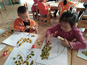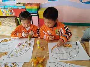 秋天是绚丽多彩的季节,秋天落叶飘飘的,中二班小朋友用橘皮制作了美丽的树叶,好看极啦,老师为我们准备画好的树叶模具,小朋友用橘皮一点一点粘贴在树叶上,不大一会,美丽多彩的树叶就制作完成了,好看极啦!通过这个活动锻炼了幼儿的动手能力及观察能力!