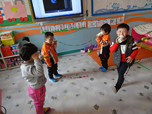 今天小四班的小朋友进行了科学活动《奇妙的声音》。小朋友们拿着玩具拍拍、敲敲、打打、听听,知道耳朵能辨别声音并了解保护耳朵的方法。两个小朋友之间拿着小喇叭,你一言我一语,能够仔细听辨声音并尝试模仿。真的好有趣呀~