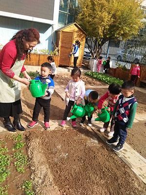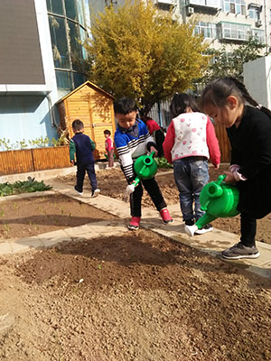 先拿小水壶,接一点水,去给菜宝宝浇水。看,小朋友们多认真啊,菠菜宝宝,你喝水之后,一定要快快长大哟!