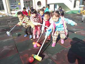 今天小三班的小朋友们在老师的带领下到户外游戏活动。曲棍打球锻炼手眼协调能力,同时锻炼身体,最后还增进小伙伴们的友谊之情。瞧!我们的进球是不是很棒啊!快来给我们加油吧!