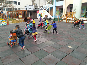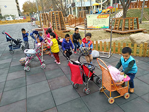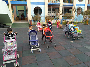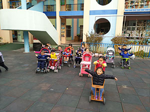通过游戏“小车骨碌碌”,孩子们又再一次感受了推、坐婴儿车的感觉,首先我们推着婴儿车去拉货物,然后再推小朋友,难度层层递进,孩子们在玩中进行手腕力量的练习和掌握推车时的平衡能力。