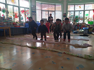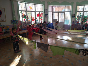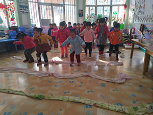 结合本周主题“身体骨碌碌”,小一班的小朋友搜集了各种布绳,教师帮助幼儿将布绳连接起来,一个幼儿拿住布绳一头,另一个幼儿将另一头系在身上,双手向上举,进行转转转,将布绳缠在身上,再向反方向转,将布绳转开。本次活动孩子们玩的很兴奋,锻炼了幼儿之间的合作能力和初步感知方位感。