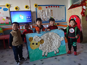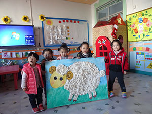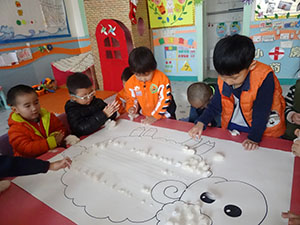 今天小四班的小朋友进行艺术活动《可爱的小绵羊》。小朋友们先认识小绵羊,观察羊毛的形状特点并愿意帮助小绵羊,知道小羊要换“新衣服”过冬了。小朋友们双手配合协调地撕贴棉花,体验制作“羊毛”的乐趣。瞧,我们制作的小绵羊漂亮吗?