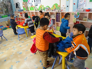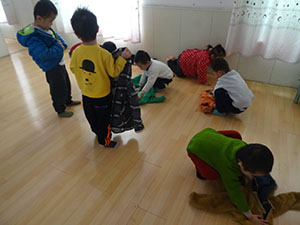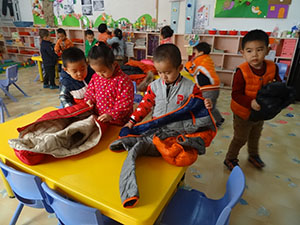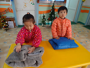 瞧!小三班的小伙伴们在和衣服做什么游戏呢?走进看看发现自己在给自己叠衣服,小嘴巴里还说着咒语, 拉链对整齐,点点头,抱抱臂,弯弯腰.呀!咒语还是很有用的,一件件小衣服叠的整整齐齐.小三班的小伙伴们早操后自己叠衣服,午休前意识自己叠衣服的哦!快来给我们点个赞吧!