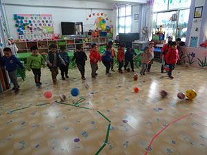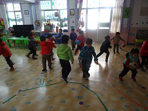 大皮球,拍拍拍,一会高,一会低,小五班的孩子们探索了皮球的几种玩法:滚球、抛球、踢球、拍球等,提高手眼协调的能力,体验了玩皮球的快乐。