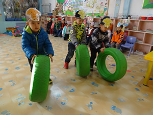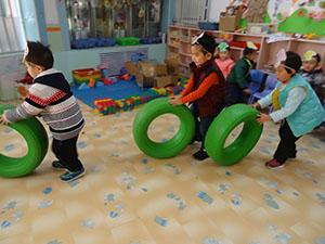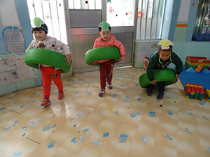 瞧!小三班的小朋友们在教室里玩什么有趣的游戏呢!原来他们把自己扮演成大象的样子正像故事里的小动物一样用自己喜欢的方法玩轮胎呢!锻炼身体四肢协调能力的同时,还增进了记忆力和想象力.小三班的小伙伴们玩儿得很开心。
