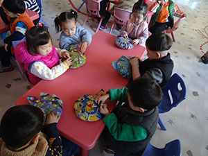 今天小四班的小朋友学习扣纽扣,每个小朋友的小星星上订了很多的扣子,小朋友们练习将扣子穿进布里,系扣子活动发展了幼儿动手动脑的能力。看,我们棒不棒呀?