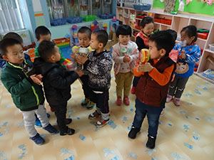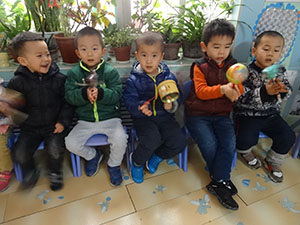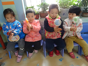 瞧!小三班的小朋友在做什么?哈哈!告诉你吧!我们在和自己的小乐器玩儿游戏呢!阳光明媚的时候晒着太阳,在室外伴着小乐器歌唱.天气渐冷我们转移在教室依旧唱着儿歌伴着乐器舞蹈.锻炼手腕肌肉的同时还增进我们对儿歌的喜爱.看我们笑得多开心啊!