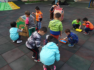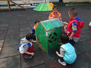 今天小三班的小朋友们在老师的带领下来到户外创作.瞧!好伙伴们拿着小刷子一点一点的粉刷着自己喜欢的颜色. 飞舞的红色、清新的绿色、纯洁的蓝色等等在动手操作的同时培养欣赏美的,增进小伙伴之间团结协作的乐趣.快来小三班欣赏漂亮的房子吧!