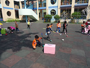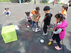 今天小四班的小朋友进行体育活动《有趣的曲棍球》。小朋友们练习将球打到制定位置,还能根据老师的口令进行体育活动,遵守游戏规则。瞧,小朋友们玩的多开心呀~
