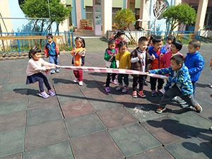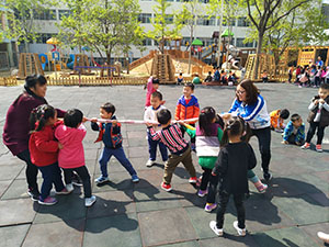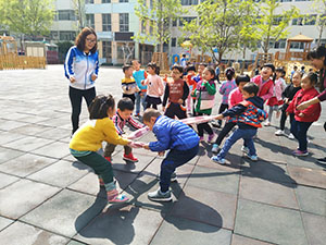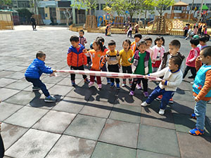 别看我们小一班的孩子年龄小,但力大无穷,孩子们正在进行单人拔河比赛,两两对决,不分上下,孩子们在拔河过程中掌握了简单的技能技巧。本活动锻炼了幼儿的臂力和下肢的力量。
