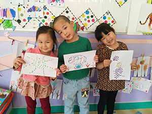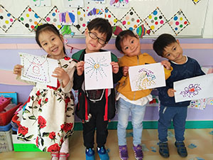 孩子们手中拿着棉棒,蘸上自己喜欢的颜色,在画纸上进行点画,有的在点画公交车、有的点画太阳、有的点画花朵....孩子们真是创意无限。本次艺术活动锻炼了幼儿手腕精细动作练习和创新能力。