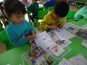 小五班孩子们尝试利用多种色彩,根据图案的不同装饰小背心,孩子们通过欣赏、设计、评价等方式完成自己的作品,锻炼了想象和动手能力。