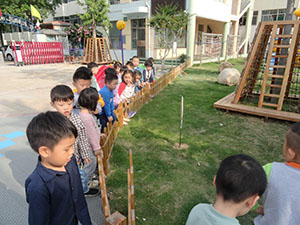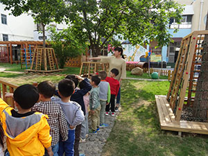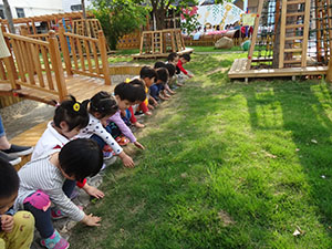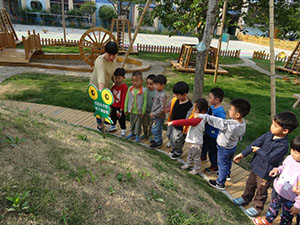幼儿园游乐场的小草慢慢长大,小五班孩子们走进游乐场通过观察指示牌、倾听老师的讲解、抚摸嫩嫩的小草增强爱护小草的意识,激发保护小草的欲望。